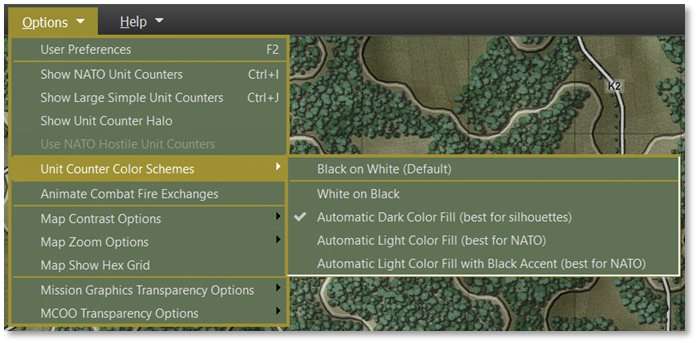 Unit Counter Color Schemes – Pops out the Unit Counter Color Scheme submenu with options for black/white as well as different color themes. See Section 11.9.1 below for a breakdown on the various color options.