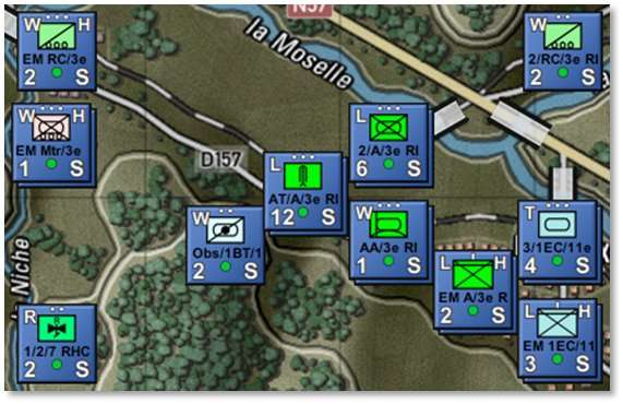 Show Large Simple Unit Counters [Ctrl+J] – Displays large NATO symbols on all the counters to make the unit type more visible at extreme zoomed-out map levels. These symbols remove some other counter information in order to be larger as demonstrated below. Default silhouette counters are on the left and Large Simple Unit Counters are on the right.