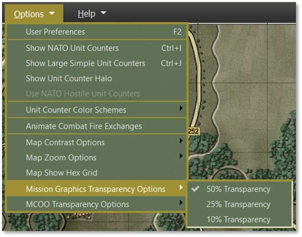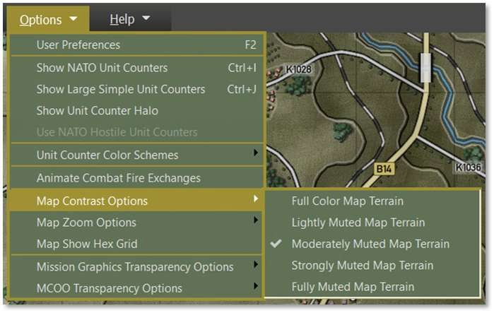 The Options Menu is used to access the User Preferences dialog, change the counters’ art style and colors, vary the map to suit your taste, and to present the counters and markers in different ways. You can also change transparency settings for the Mission Graphics (see Section 11.4 above for Mission Graphics information) and MCOO (see Section 16.12 below). Each option is described in turn.