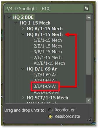 To move a unit from one command to another, click on the unit being moved, in this case 3/D/1-69 Ar as shown below, and drag it up to the new HQ name whose formation it will join and release the mouse button (see left image). Here, we are subordinating it to HQ B/1-15 Mech. The unit should appear at the bottom of the new HQ’s formation after releasing the mouse button, as seen in the right image.