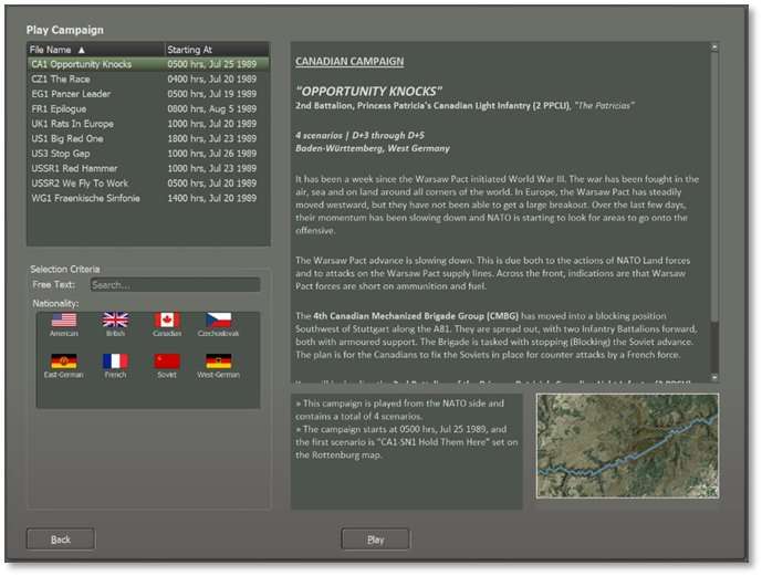 A campaign is a sequence of scenarios from one nation’s perspective where the result of one scenario may influence the subsequent scenario. The player will be able to carry over core forces from scenario to scenario. This means that campaign scenarios might play out very differently from single scenarios because it is of vital importance to preserve your forces as you try to win your part of the war.