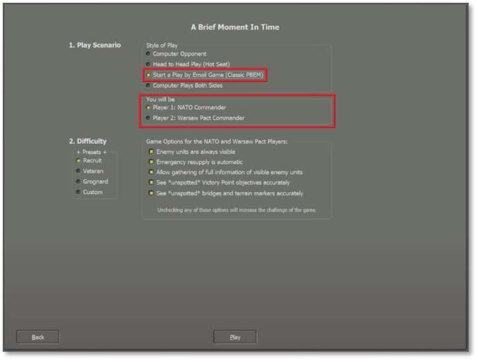 At the Main Menu, select New Scenario. Then select the scenario you wish to play with your opponent and click Play (see Section 4.1 above for details on the selection process). In the following dialog, as seen below, select the Start a Play by Email Game (Classic PBEM) option under Style of Play. Next, choose which side you will command in the scenario. Select the Difficulty Settings (refer to Section 4.3 above) to be used for the scenario and click the Play button.