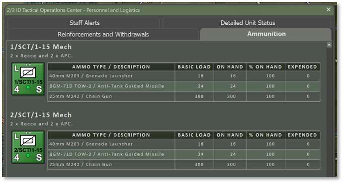 The ammunition available for a unit and its subunits are noted in a few places. It can be viewed in the Subunits tab of the Dashboard for each subunit (see Section 14.2.3 above) and on the Ammunition tab in the Personnel and Logistic Staff Report for the entire unit (see Section 15.5.4 above). See images below. More detail is shown in the Ammunition tab which provides the number of rounds expended up to that current point of time in the battle.
