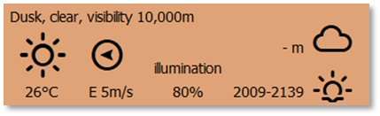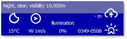 Night is the time from after sunset until sunrise. The maximum Visibility is determined by the level of Illumination based on the phase of the moon. Operation of aircraft may be impacted if those aircraft are not capable of night operations. The upcoming Dawn transition time is provided in the bottom right of the panel.