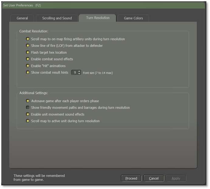 Scroll Map to Active Unit During Turn Resolution – When checked, the map centers on the active unit during turn resolution. Like the other scrolling option above, this can also be helpful to watch all activity/combat events as they unfold. It can be dizzying if the game is set to resolve quickly through the General custom preferences.