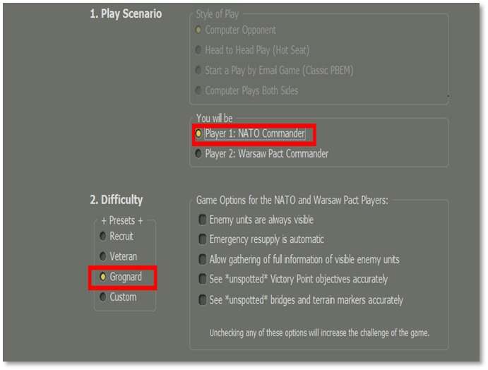 Select the Difficulty level at “Grognard”, then select the “Play” button to proceed to the next screen.