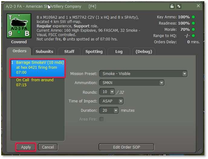 Here, you can adjust the number of rounds, the time of impact, and the duration. Leave the rest of the settings for this tutorial as shown in the screenshot above. Then click on the “Apply” button to confirm this Fire Mission. Exit with the “X” in the top right corner.