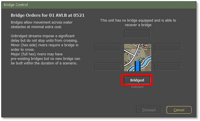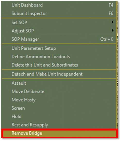 Select the engineer squad and issue the “Remove Bridge” command, as shown above. The Bridge Control screen will appear. Select the “Bridged” location as in the image below.