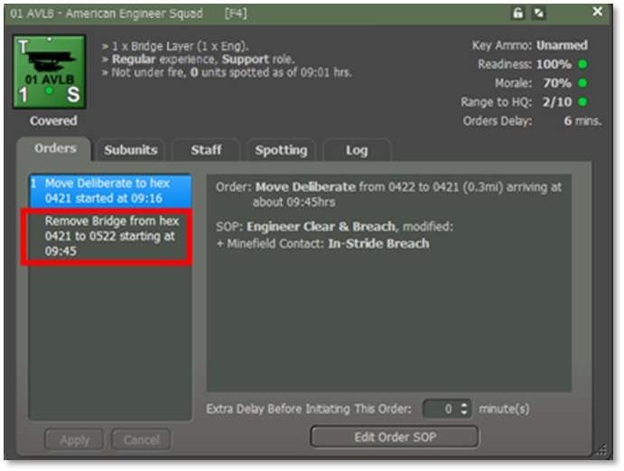 Press Start at this time to commence the next turn resolution and the 01 AVLB will begin the process of laying the bridge. It may take several turns to complete the bridge. Once the bridge building is complete, the Engineer Report will now show that the 01 AVLB bridge is deployed. You can also go to the unit dashboard to see the Log for that bridge layer. As shown in the Dashboard/Log below.