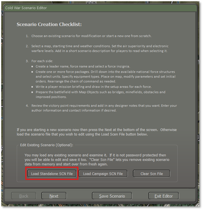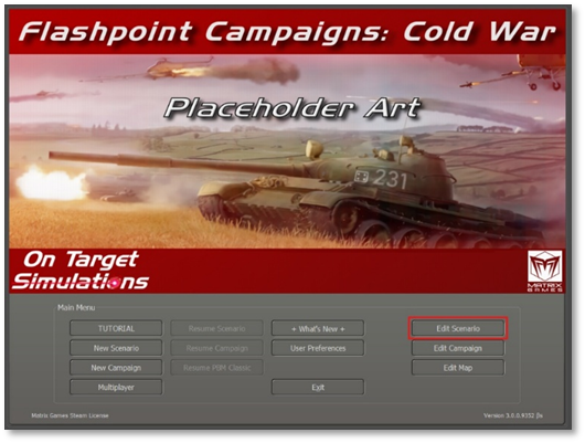 First, we must enter the Scenario Editor from the Main Menu screen. Click on the “Scenario” button in the Edit section.