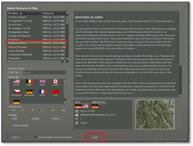 For this example, I am going to edit a scenario called “Brothers in Arms”. As the information notes, it is a small scenario featuring Cold War American, West-German and East-German units. Click “Load” to load the scenario.