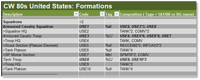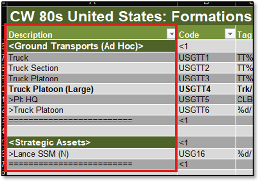 You can assign more than one filter to a row if they are comma- delimited. This allows for certain formations to appear in multiple Task Force Types. Check the supplied data files to see examples of Task Force Type use.