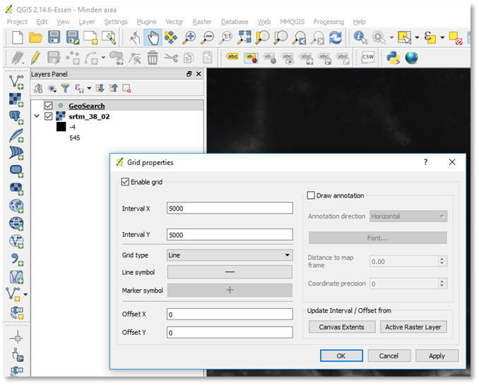 Next, enable a decorative square grid at 5km scale. This will help us draw a box reflecting the intended map size. To display the decorative grid, use the "View" menu, Decorations, Grid. In the Grid properties dialog, select Enable grid, and set the Interval X and Interval Y to 5000 (meters). Press Apply and OK.