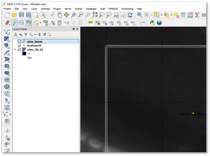 Select the area_boxes layer, then select the Minden area box in the layer. Next, use View menu, "Zoom to Selection" to focus on the map area.