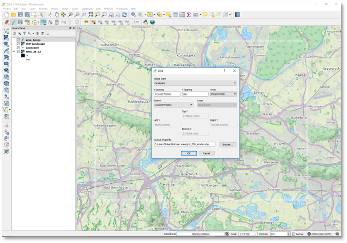 Create the hex grid layer using the "MMQGis" menu, Create, Create Grid. In the "Grid" dialog, change the Shape Type to Hexagons. Change the output Shapefile to save the grid as "grid_500_minden" in our project folder (via the Browse button). Use Project Units (should be metric). Choose Extent "Current Window". Set Y-spacing to 500 (X-spacing will automatically adjust to 433). Press OK to create the hex grid layer.