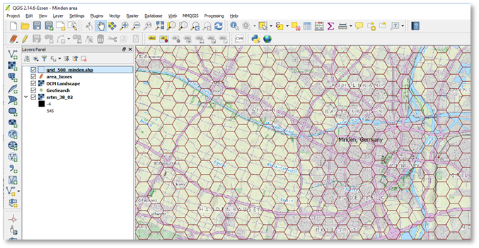 Finally, we try to tweak the position of the hex grid such that the major river Weser and the Mittellandkanal runs through the center of the hex (especially where their roads and rail roads near). This to minimize the shifting of roads when we represent those wide rivers and canals as full 500m hexes. Obviously, achieving a perfect placement isn't possible since nature (outside beehives) doesn't conform to hexagons.