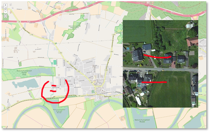 The illustration above shows a nameless stream that is wide enough to be an obstacle and runs from the Weser River north towards the highway, then tunnels below the highway and appears as a tiny ditch north of the highway. In other words, it only presents an obstacle between the highway and the Weser.