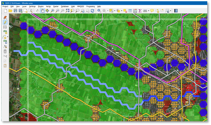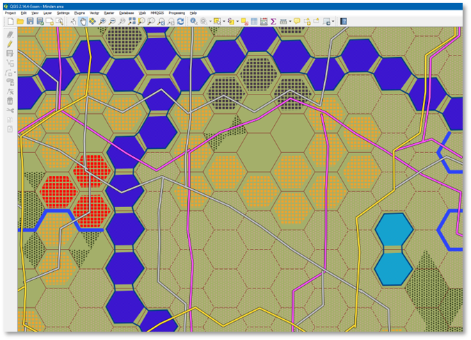 Our map has a few locations where the elevation values do not correctly reflect the ridge’s elevation. We are going to correct this in QGis, by placing hex shaped polygons in those locations where we want to correct elevation and set the correct elevation value for them. The layer’s style is set-up such that it will display a polygon with the right color for the elevation set.