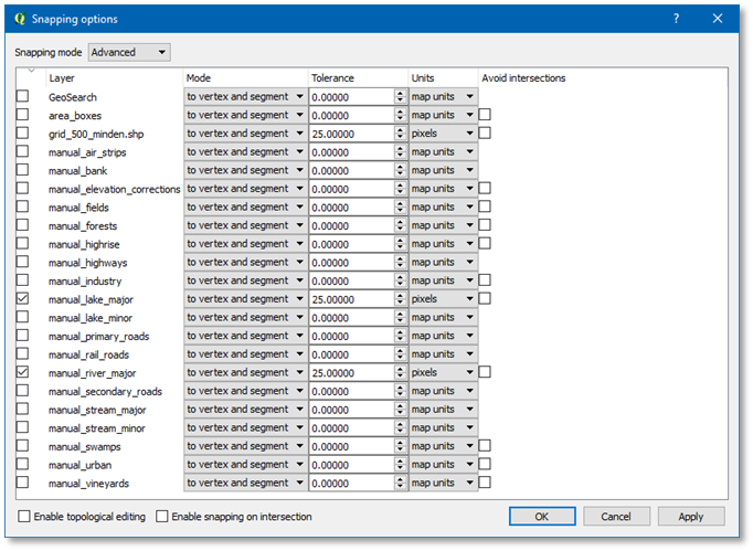 Instead, we’ll just use the manual_lake_major and manual_river_major polygons to snap to and deselect snapping to any other layers.