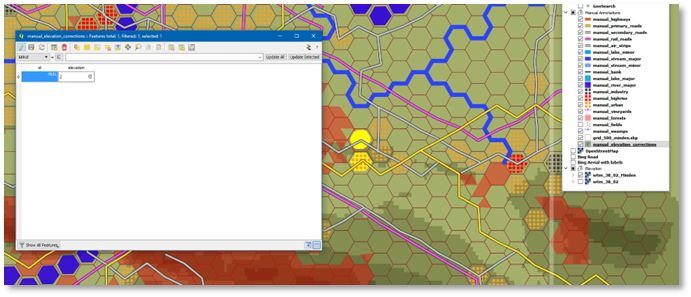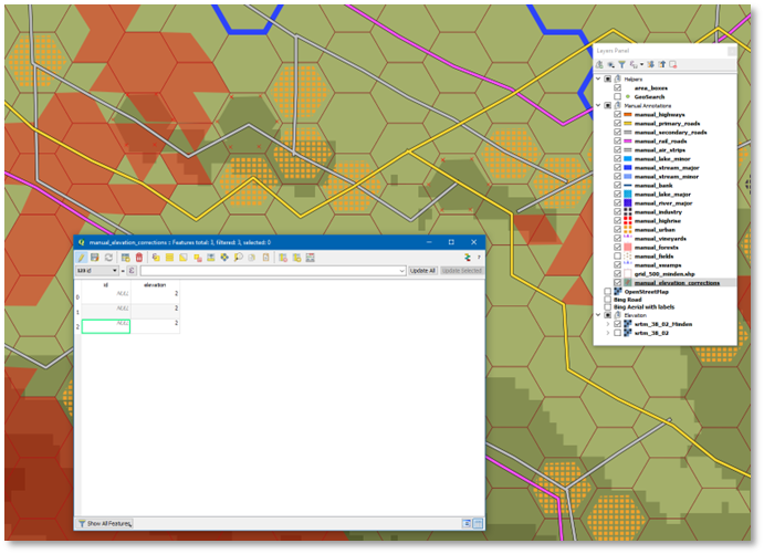 Enable manual_elevation_corrections layer for editing. Select a hex shape on the manual_urban layer, copy it, switch to the manual_elevation_corrections layer, and paste it at the location where you want to correct the elevation. Next, with the shape still selected, use the Layer menu, Open Attribute Table. For the newly created shape, enter in the “elevation” column the intended elevation, then press the Save Edits button.