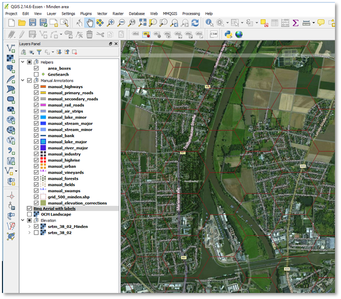 Approximately 100 new hex shapes later, the Weser and the Kanal are covered, but not without running into the occasional dilemma of where to place the hex shape, trying to balance representing the flow the river / canal, not covering key roads, and not covering key hills. Don’t deliberate too long; QGis makes it relatively easy to revisit your current decision later, when you have more information (about the position of roads, etc.).