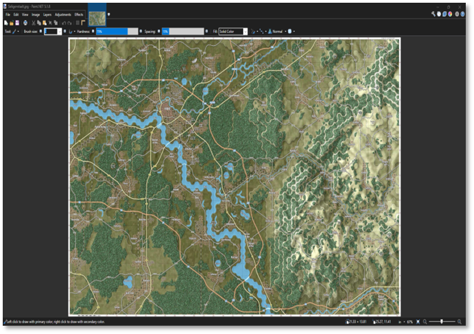 Paint.NET gives you more control when creating detailed and layered military overlays. It works like a simple photo editor but lets you stack layers, use transparent backgrounds, and precisely place arrows, rings, and symbols. In this section, you’ll learn how to open your base map, add graphics on separate layers, label your units, and export a clean overlay image — perfect for use in scenarios or mission briefings.