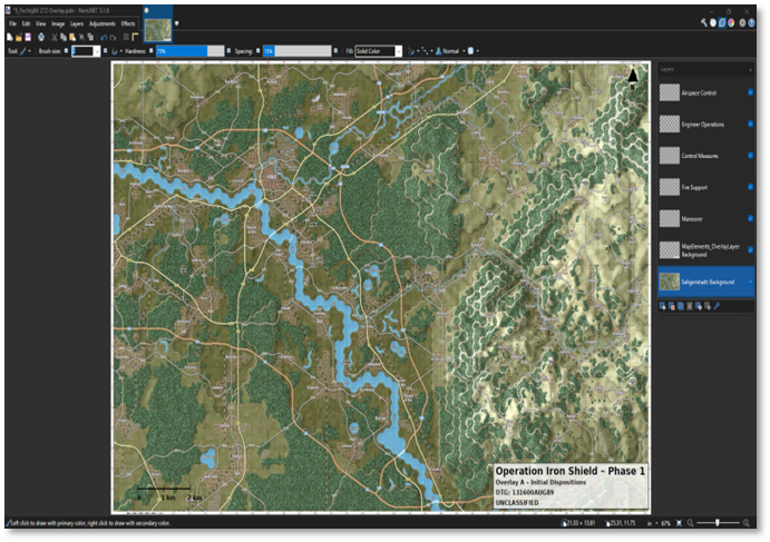PowerPoint offers an intuitive platform for quickly assembling slides, layering unit symbols, drawing movement arrows, and labeling terrain or objectives using NATO standard symbology. Its built-in alignment tools make it ideal for structured overlays. Paint.NET, on the other hand, provides more granular control over pixel-level editing, transparency effects, and layering, making it well-suited for refining maps, adjusting colors, or integrating screenshots. Together, these tools allow planners and scenario designers to build transparent, professional-quality overlays that enhance situational awareness and support mission planning.