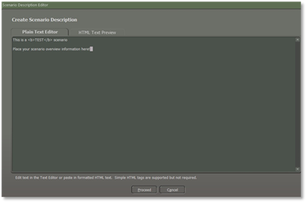 The Plain Text Editor allows you to write your text narrative for the scenario and use simple HTML5 tags to enhance the look of the Scenario Description. See “Section 8. HTML Quick Preference” for HMTL tags.