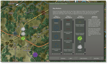 These functions include map obstacles like mines, NBC contamination, fortifications, smoke, bridges, and Victory Point (VP) markers. The dialog shown below shows most of those markers.