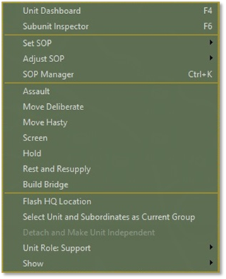 After creating your forces, you may need or want to make changes to the ammo loadout to your units. First, select “Menu” which is located under the unit icon. To do that you open the Unit Dashboard and select “Define Ammunitions Loadout” as shown in Figure 110.