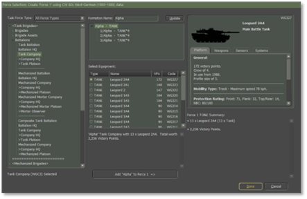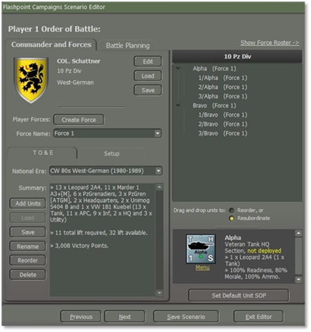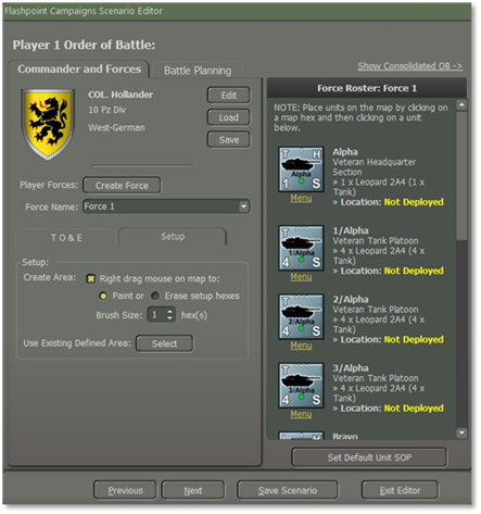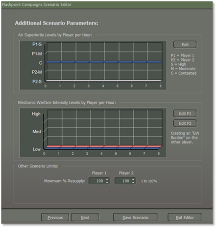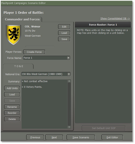 At the bottom of the first panel is the “Scenario Description” text box. The scenario description is used to tell players the background information that sets up the battle, but not mission specifics for each side. That is done later in the editor.