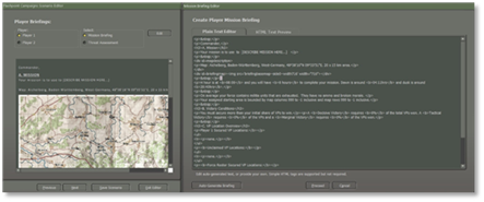 The mission briefings should follow the scenario narrative that you wrote in the Scenario Description panel, but you do not need to repeat all that information. Focus on providing the side specifics details.