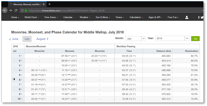 Again, from the same web site, we obtain moon timings and lunar phase. Click the ‘Moonrise and Moonset’ drop down below the Middle Wallop banner, then select the month July 2018 again: https://www.timeanddate.com/moon/@2642574?month=7&year=2018.