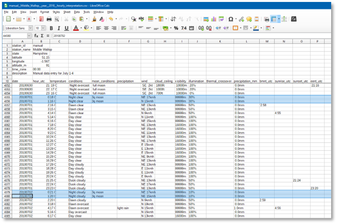 Let us say, we want to use pseudo-random July weather for the Salisbury Plains UK area, with three different weather days being sufficient for pseudo-random weather. Which means we need to obtain and enter 3 x 24 consecutive hours + 23 hours is approximately 96 hours of weather data.