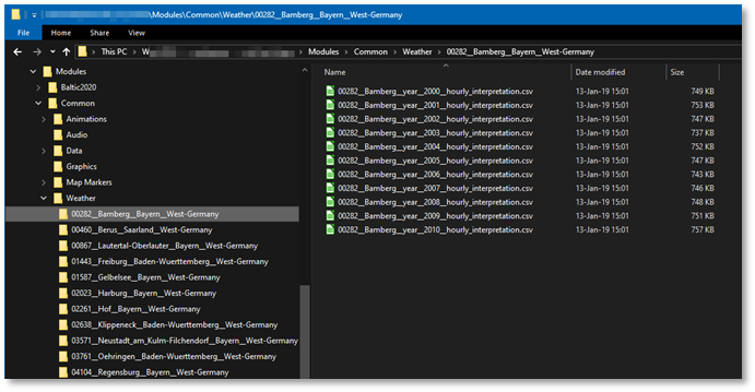 The format for hourly weather data files is: *_year__####_*.csv. In words, the filename should contain a part ‘_year_’ followed by the year (as four digits) and be a .csv file. For example, ‘00282__Bamberg__year__2010__hourly_interpretation.csv’.