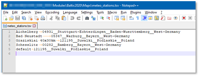 In each Module’s Maps folder, there is a file ‘meteo_stations.tsv’ file. Its contents look like this: