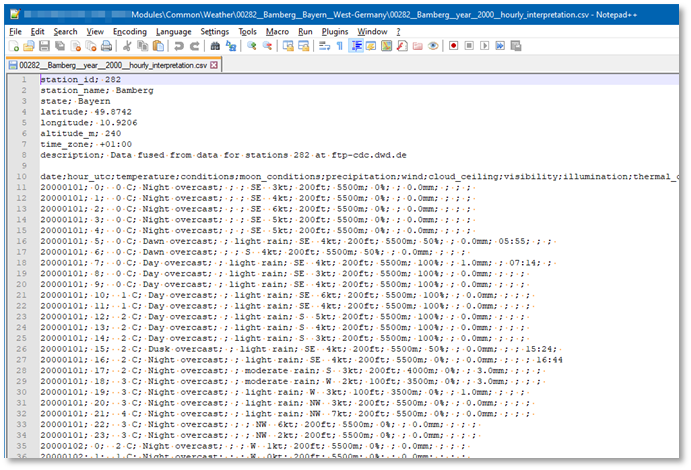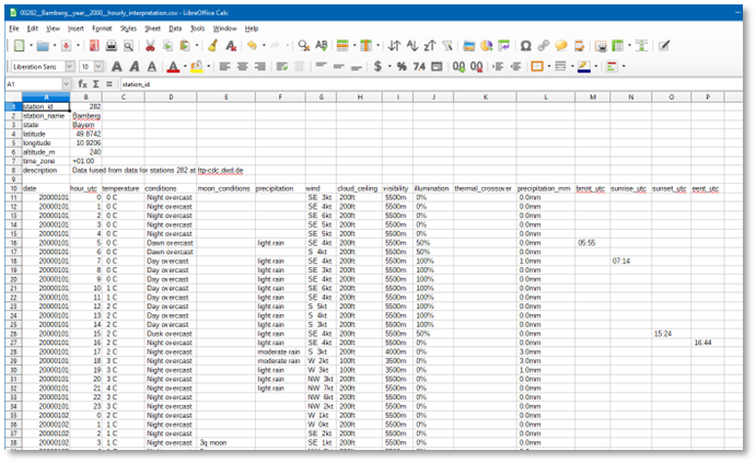 After a header and a blank row, the bulk of the data follows, in 16 columns. The first row defines the header and is followed by 365 or 366 days of 24 hours of weather.